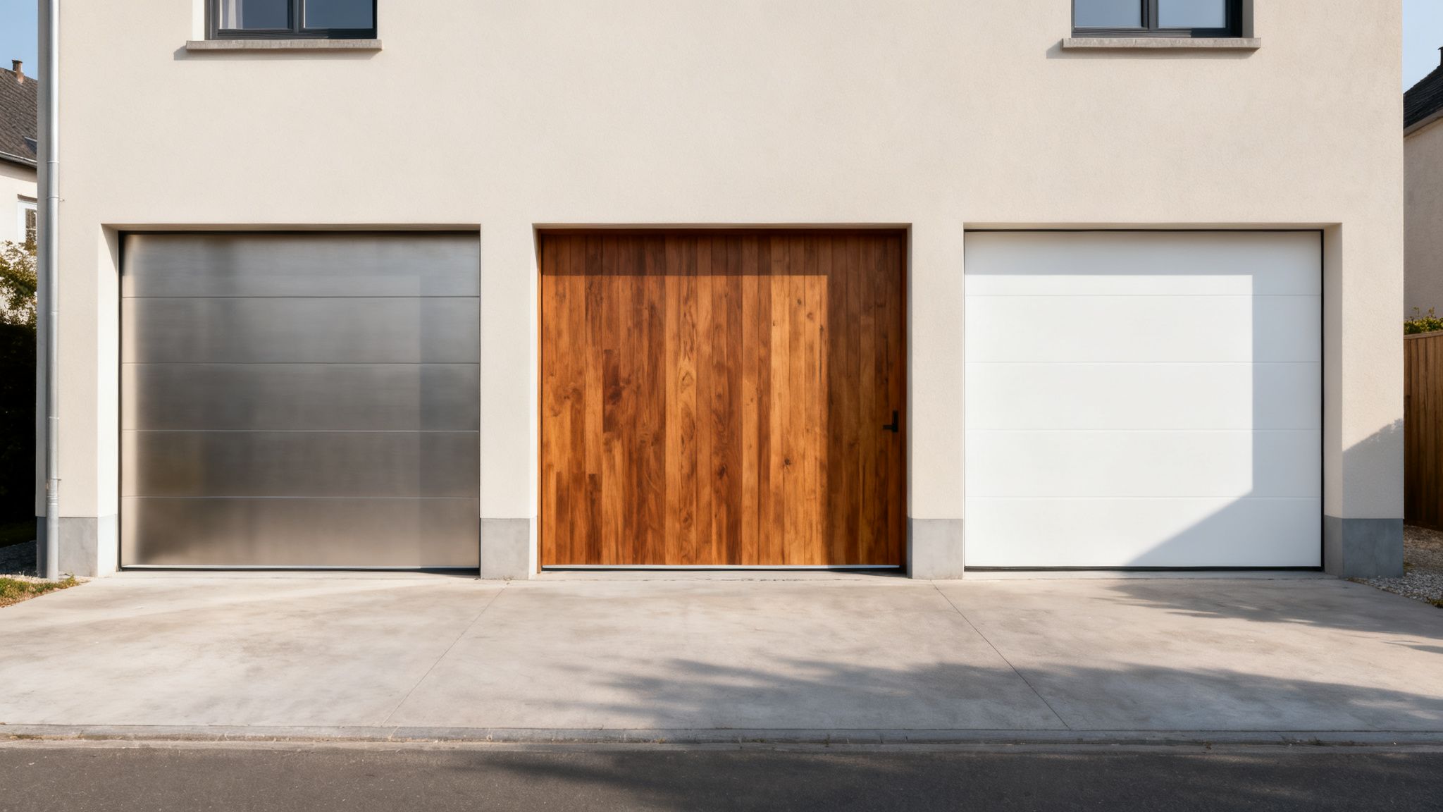 Trois portes de garage modernes (acier, bois, blanche) sur une façade claire d'une maison contemporaine.